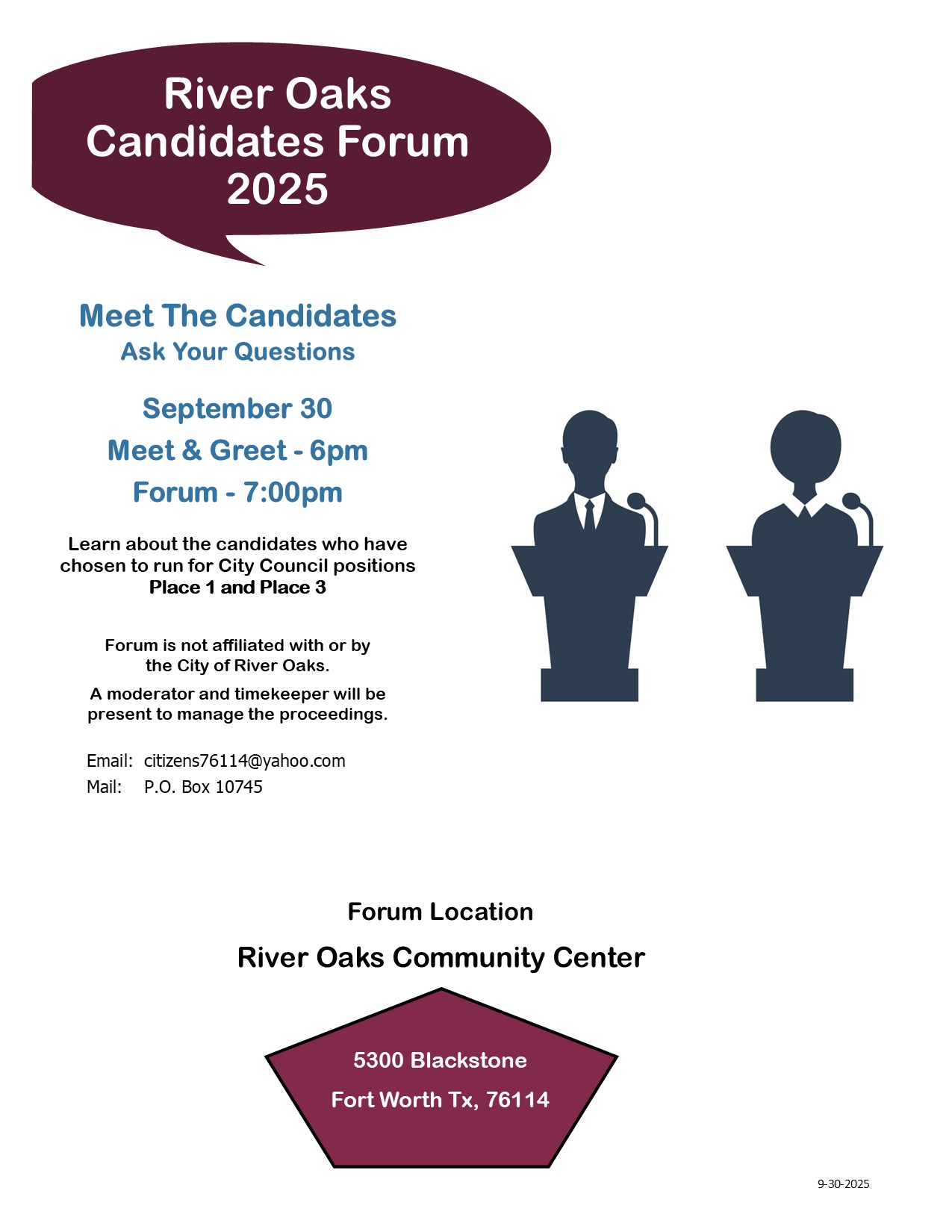 Citizens are invited to attend a forum held for candidates who are seeking River Oaks City Council positions Place 1 and Place 3.